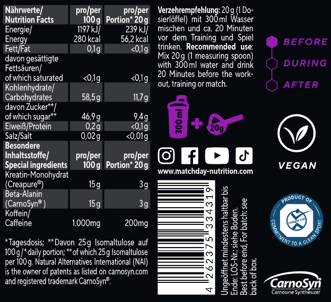 20g Pulver (1 Messlöffel) mit 300ml Wasser mischen und 20 Minuten vor dem Training und Spiel trinken.