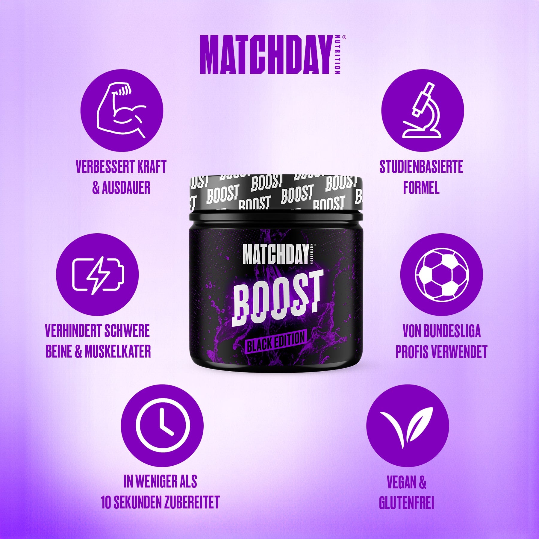 Unsere BOOST Black Edition dagegen enthält das Kohlenhydrat Isomaltulose, dass deinen Blutzuckerspiegel stabilisiert! Mit 200mg Koffein pro Portion ist der BOOST Studien basiert dosiert - so kannst du die vollen Vorteile von Koffein auf dem Platz nutzen und 90 Minuten Vollgas geben!